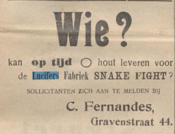 Datum: 28-05-1923, krant onbekend. Het is niet duidelijk waar dit betrekking op heeft, men heeft het over een 'rondschrijven betreffende onze lucifers'. Wie weet meer?